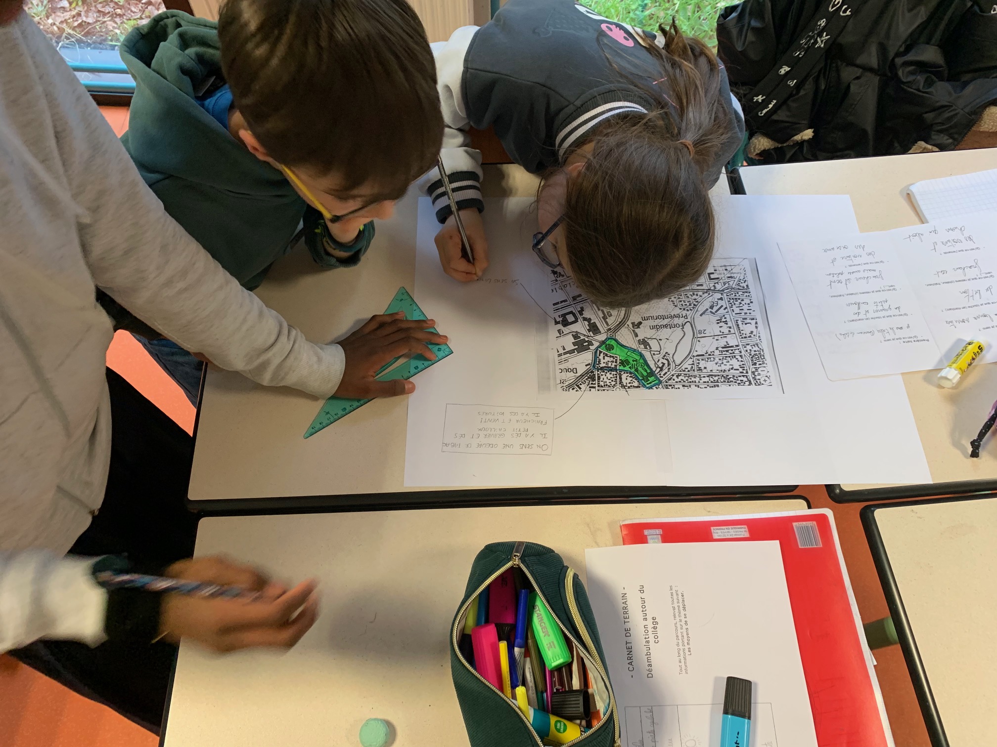 En équipe avec des étudiants et étudiantes de Master et encadrés par Marina Duféal, enseignante-chercheure en Géographie à l’Université Bordeaux Montaigne ainsi que les enseignantes d’Histoire-géographie du collège, les élèves de 4ème du collège ont pu mobiliser les compétences cartographiques qu’ils avaient construites l’an passé.